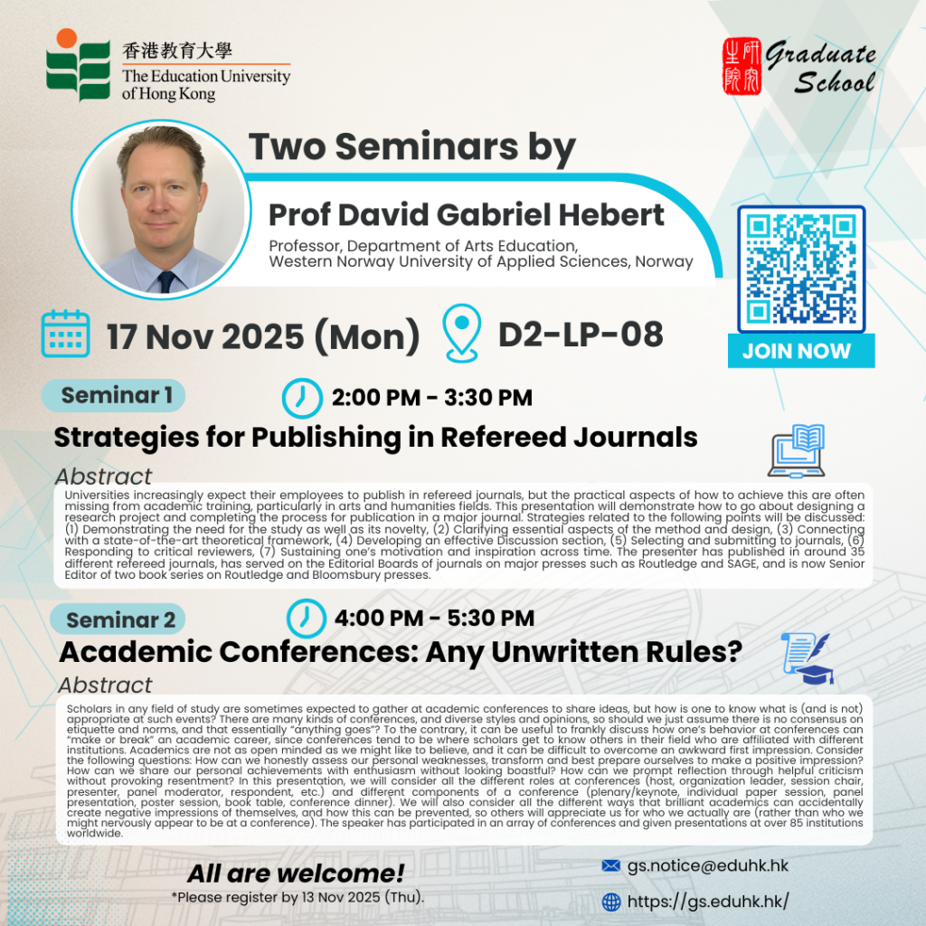 The Journal Publication Process was the topic of a well-received workshop by Dr Lucas Kohnke, EdD Programme Coordinator and Senior Lecturer from the Department of English Language Education, on October 24th. The workshop began with an interactive warm-up that enabled a relaxed and engaging learning atmosphere. Dr Kohnke emphasised the critical importance of identifying an … Continued
