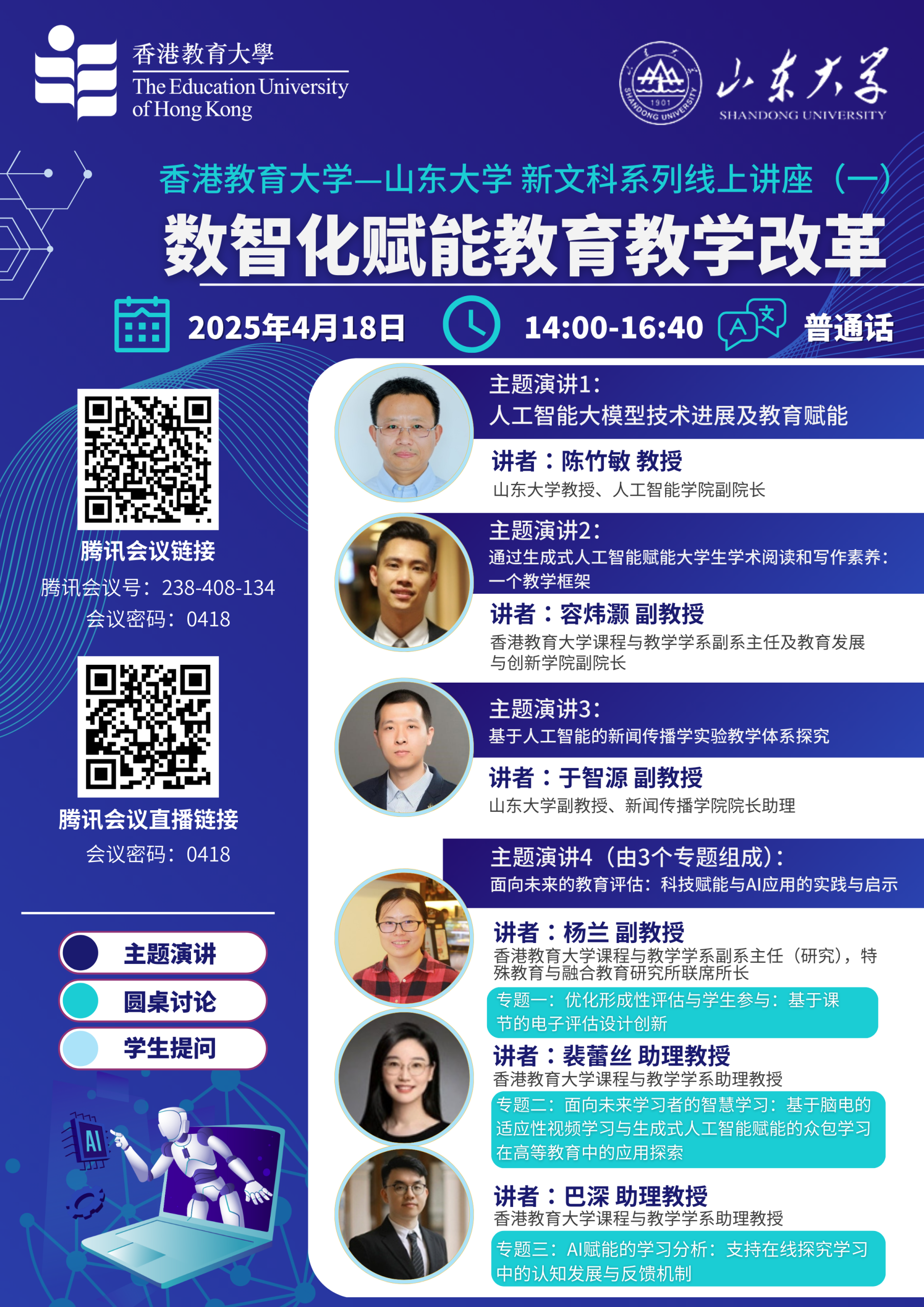 4月18日 [誠邀參加] 香港教育大學-山東大學新文科系列線上講座(一):數智化賦能教育教學改革