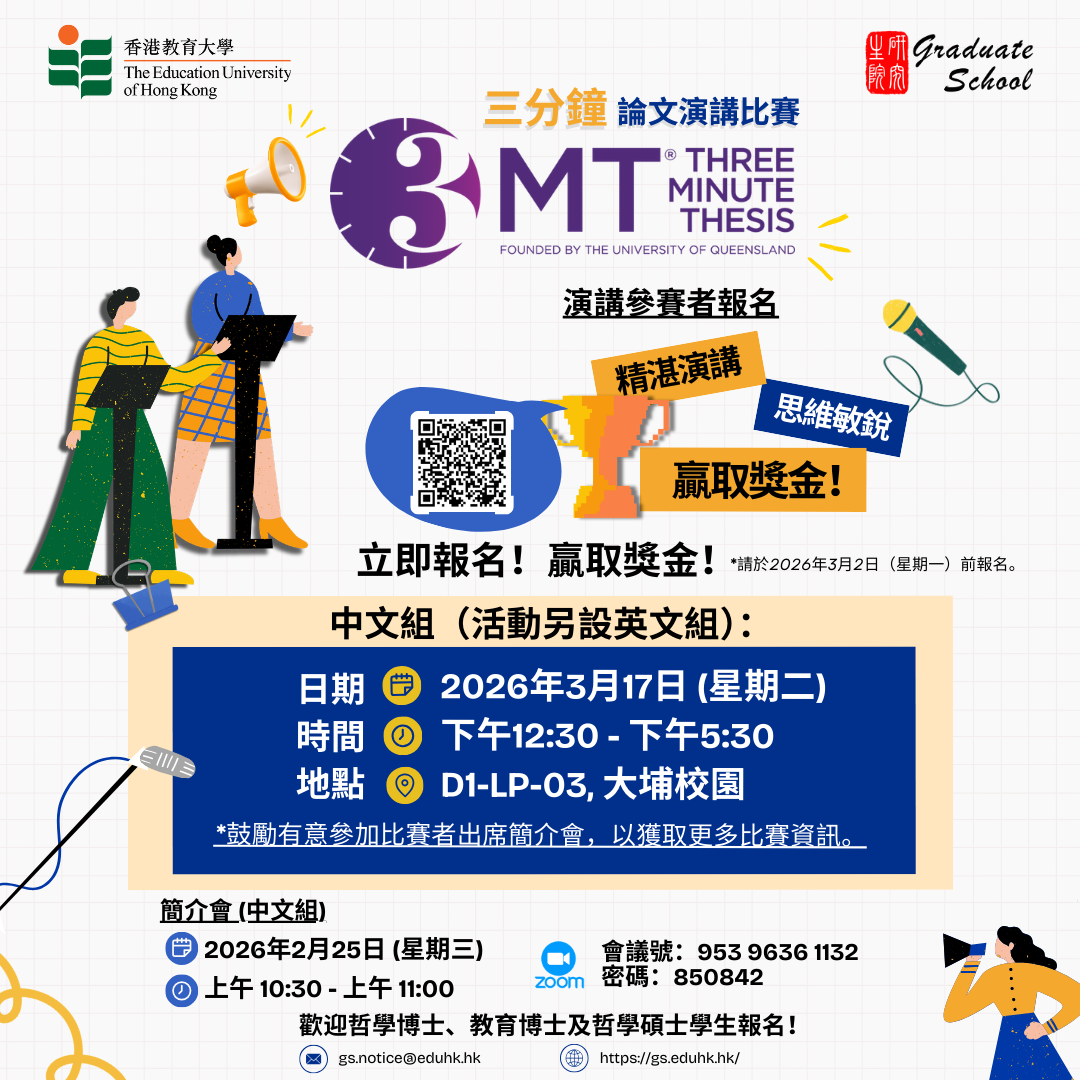[參加教大三分鐘論文演講比賽 2026] – 在3分鐘內分享你的研究並贏取現金獎勵!(中文組)