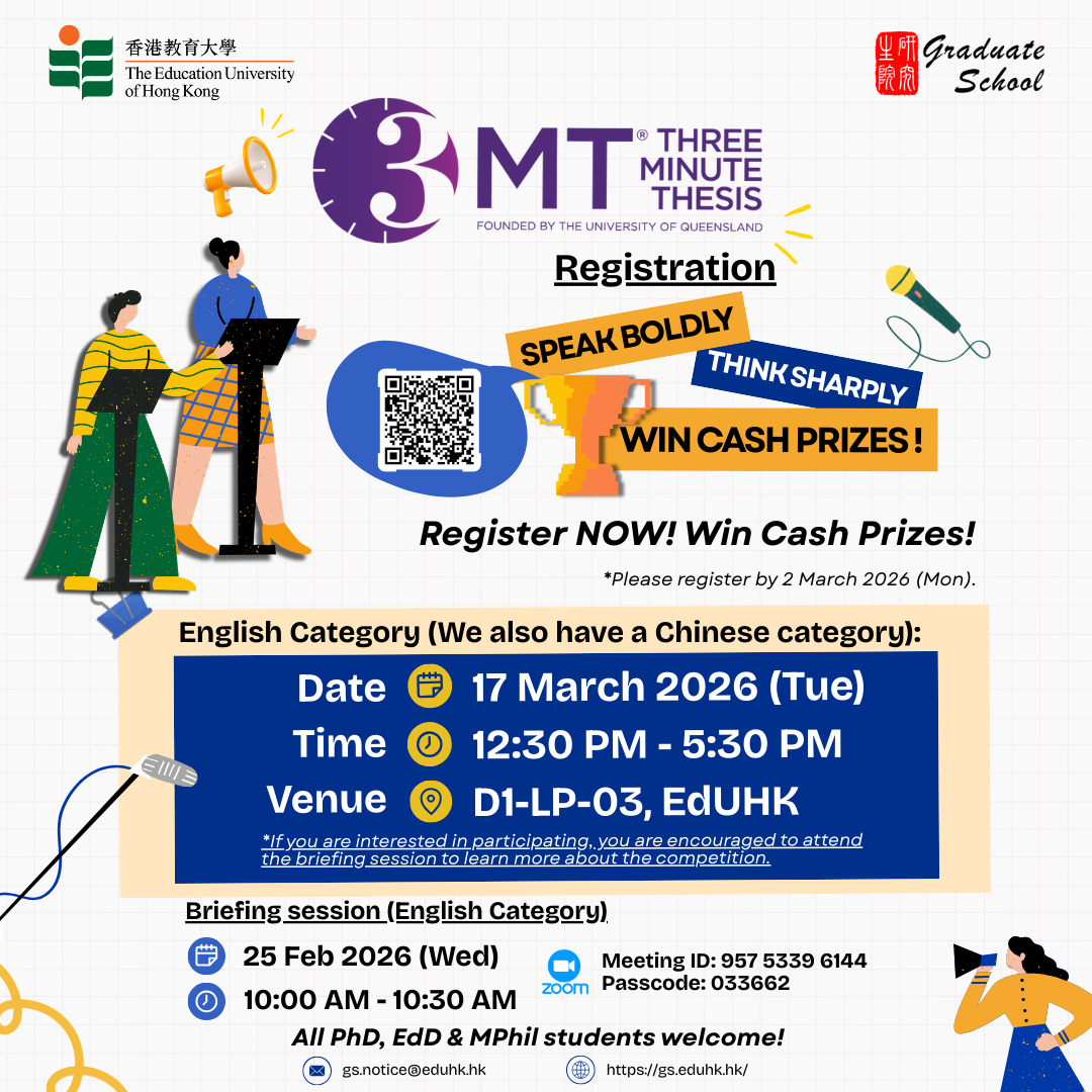 [Participating in the EdUHK 3MT® Competition 2026] Share Your Research in 3 Minutes & Win Cash Prizes! (English Category)