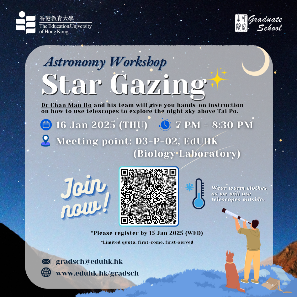You are invited to attend the “Star Gazing”, an Astronomy Workshop hosted by Dr Chan Man Ho and his team. You will receive hands-on instruction on how to use telescopes before exploring the night sky above Tai Po and beyond.
