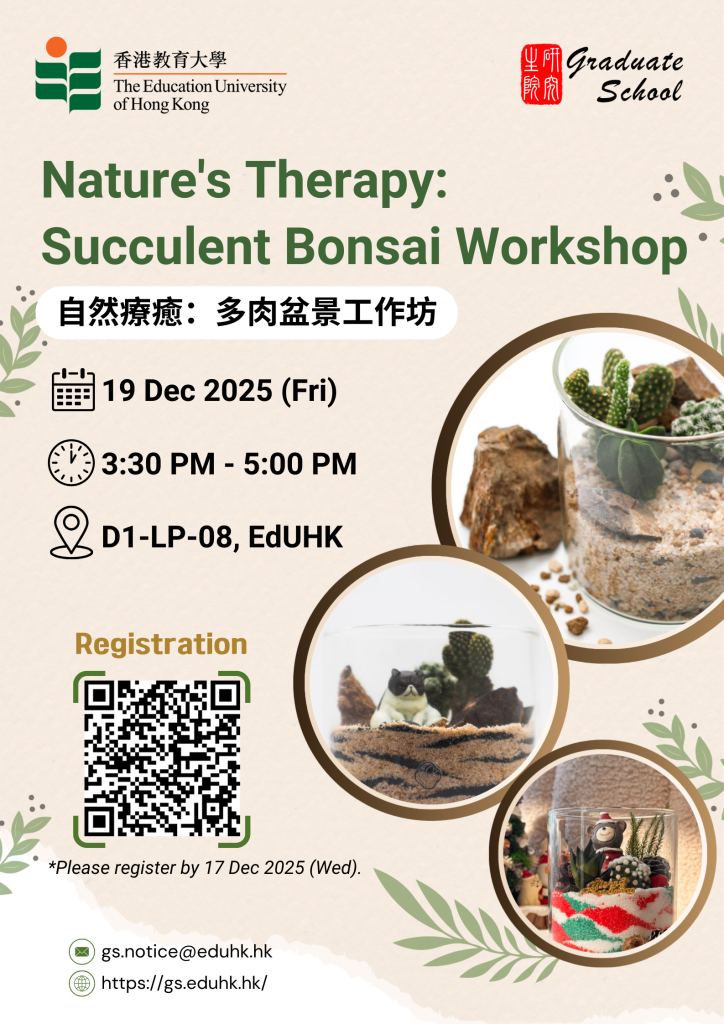 You are warmly invited to our rejuvenating workshop, “Nature’s Therapy: Succulent Bonsai Workshop”, hosted by the Graduate School (GS). This is a wonderful opportunity to unwind, ignite your creativity, and explore the calming art of crafting succulent bonsai.