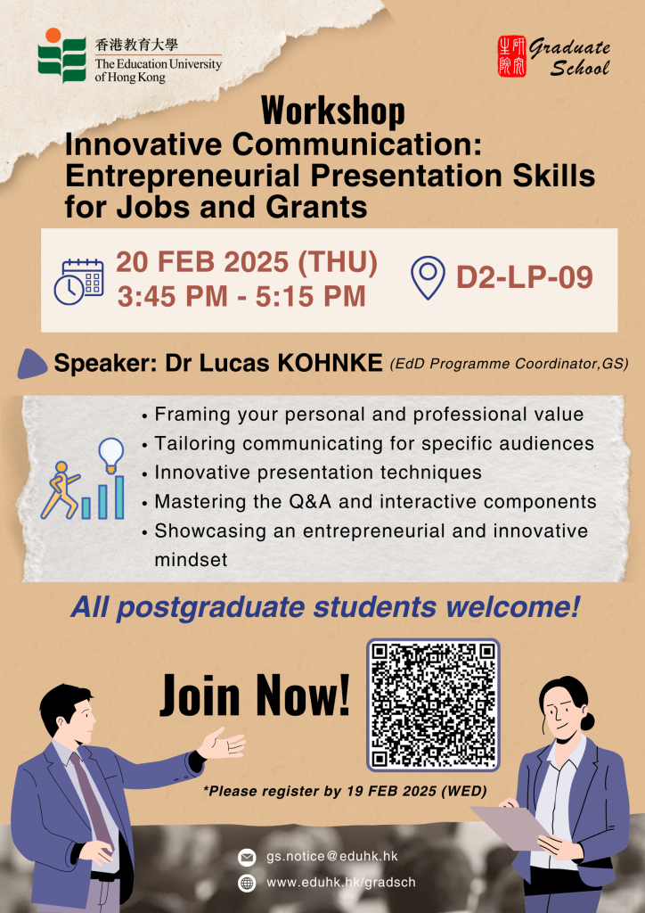 You are cordially invited to attend the GS Academic Workshop Series (Semester 2, 2024-25), titled “Innovative Communication: Entrepreneurial Presentation Skills for Jobs and Grants.” Dr Lucas KOHNKE, our EdD Programme Coordinator, will guide you in exploring: