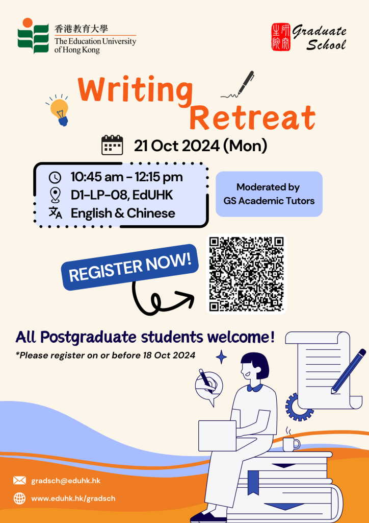 You are invited to attend the Writing Retreat organised by the Graduate School (GS). You could use the time to work on your writing and seek assistance from our GS tutors if needed.