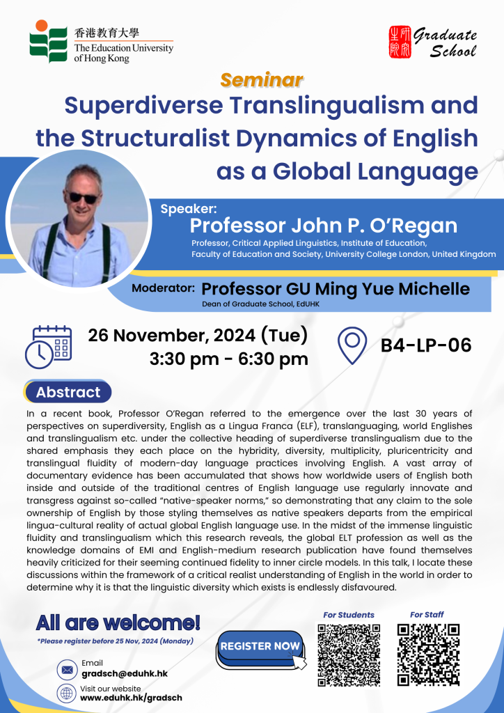 You are cordially invited to attend the seminar on Superdiverse Translingualism and the Structuralist Dynamics of English as a Global Language, organised by the Graduate School (GS). Details are as follows: