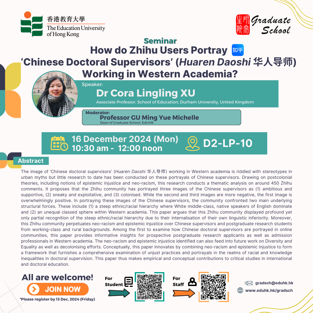 [16 Dec] Seminar: How do Zhihu Users Portray ‘Chinese Doctoral Supervisors’ (Huaren Daoshi 华人导师) Working in Western Academia?