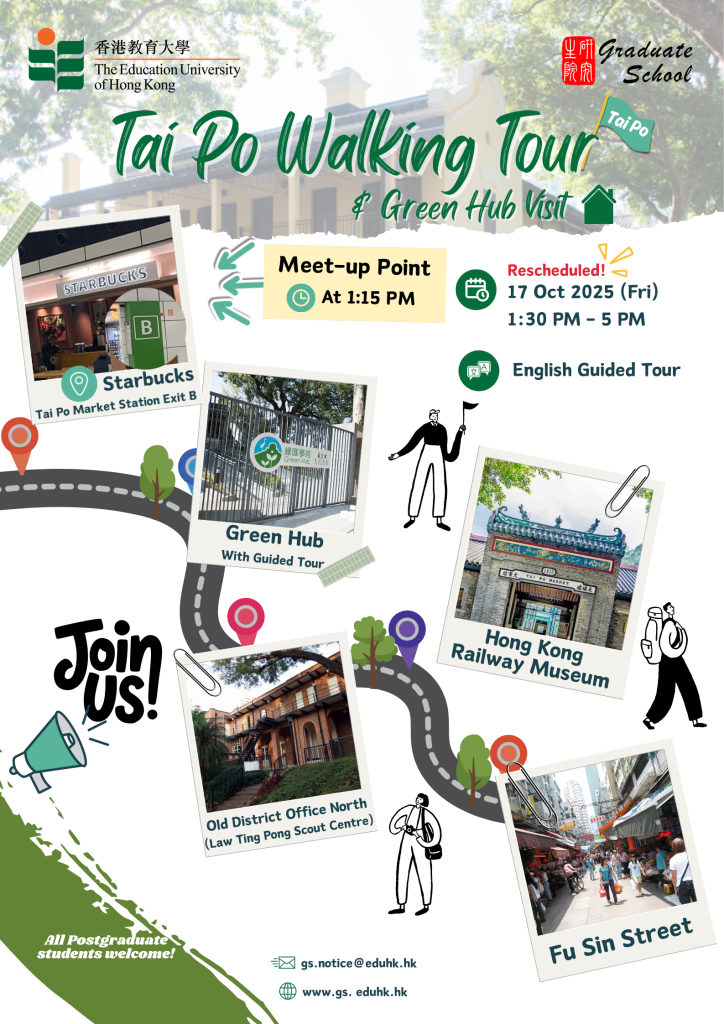 Please be informed that the “Tai Po Walking Tour & Green Hub Visit” will be rescheduled for 17 October 2025 (Friday). 「悠遊大埔及綠匯學院探訪」將會延期至10月17日(星期五)舉行