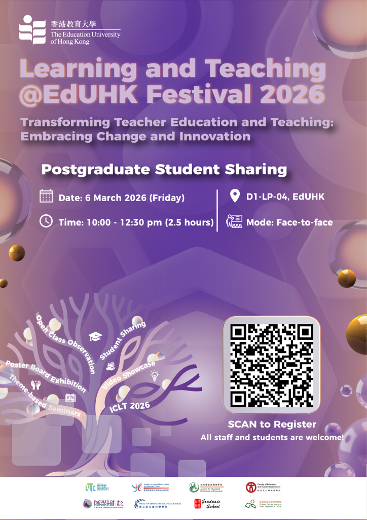 For details about the sharing session, please refer to the attached poster or visit here. Should you have any inquiries, please contact GS at gradsch@eduhk.hk or LTTC at lttc@eduhk.hk.