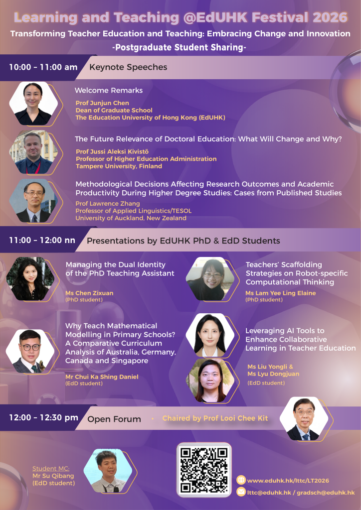 | Presentations by EdUHK PhD & EdD Students: | Managing the Dual Identity of the PhD Teaching Assistant Ms Chen Zixuan (PhD student) Teachers’ Scaffolding Strategies on Robot-specific Computational Thinking Ms Lam Yee Ling Elaine (PhD student) Why Teach Mathematical Modelling in Primary Schools? A Comparative Curriculum Analysis of Australia, Germany, Canada and Singapore Mr Chui Ka Shing Daniel (EdD student) Leveraging AI Tools to Enhance Collaborative Learning in Teacher Education Ms Liu Yongli & Ms Lyu Dongjuan (EdD student) |