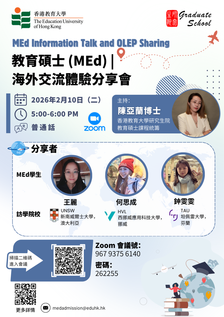為幫助同學們更深入理解海外交流帶來的機遇與轉變,香港教育大學教育碩士(MEd)課程特別推出海外交流主題分享會。本次活動將由教育碩士課程統籌陳亞蘭博士主持,並邀請三位於2025年12月參加MEd海外學習體驗計劃(OLEP)的同學們,分享她們跨越文化邊界的學習歷程、自我發展與突破。
